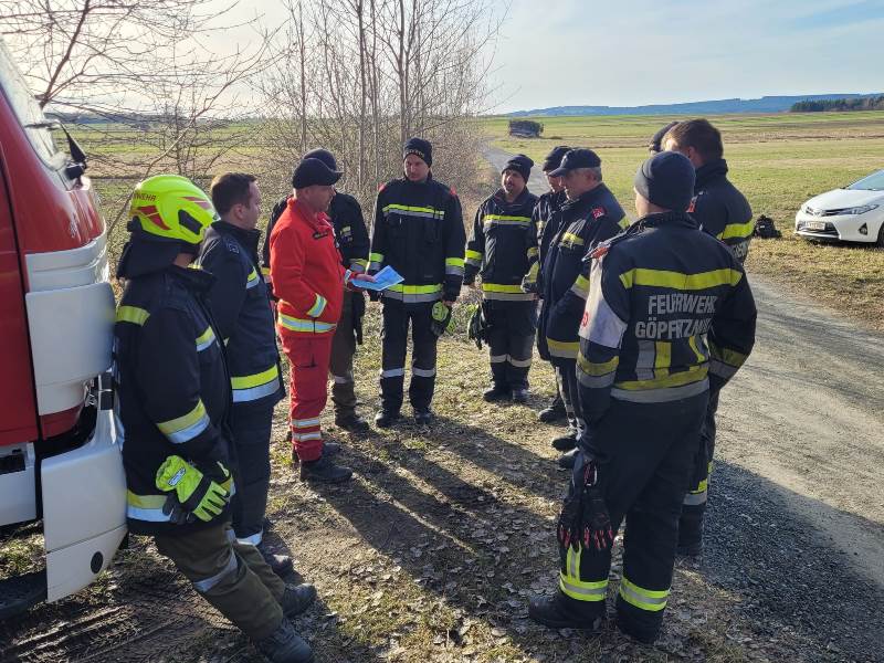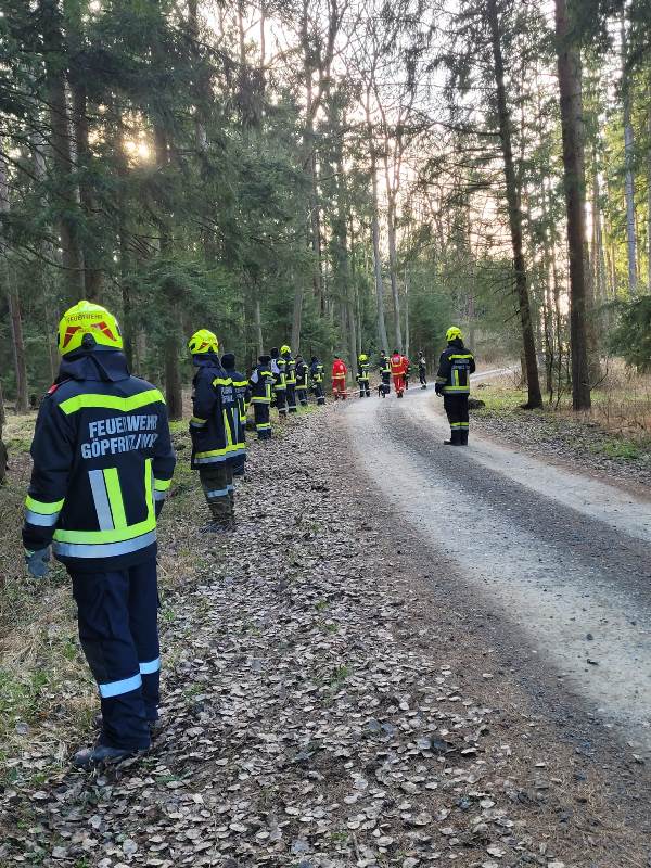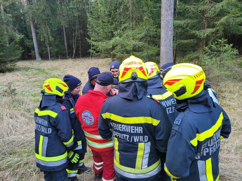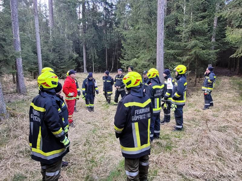 In weiterer Folge versteckte sich eine Person in einem vorab definierten Bereich und musste von den Mitgliedern der Freiwilligen Feuerwehr Göpfritz/Wild sowie durch zwei Suchhunde gesucht werden. Im Zuge der Suche konnten die Mitglieder ihr neu erworbenes Wissens bestens anwenden und dabei viele weitere Aspekte kennenlernen und dabei erkennen, wie wichtig die strukturierte Herangehensweise ist. Gemeinsam mit den Suchhunden konnte die Person so sehr rasch gefunden werden.