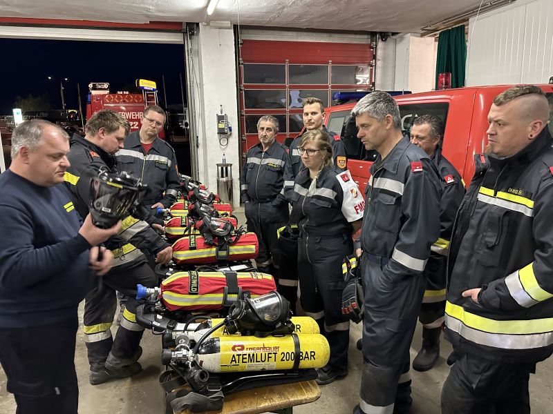 Im Zuge der Vorstellung und Indienststellung der neu beschafften Atemschutzgeräte wurde im Vorfeld auf die grundlegende Funktionsweise der einzelnen Komponenten (Tragvorrichtung, Atemluftflasche, Lungenautomat, Druckminderer, Manometer, Warneinrichtung,...) eingegangen, ehe in praktischen Übungen die Handhabung der Atemschutzgeräte außerhalb der Theorie beübt wurde.