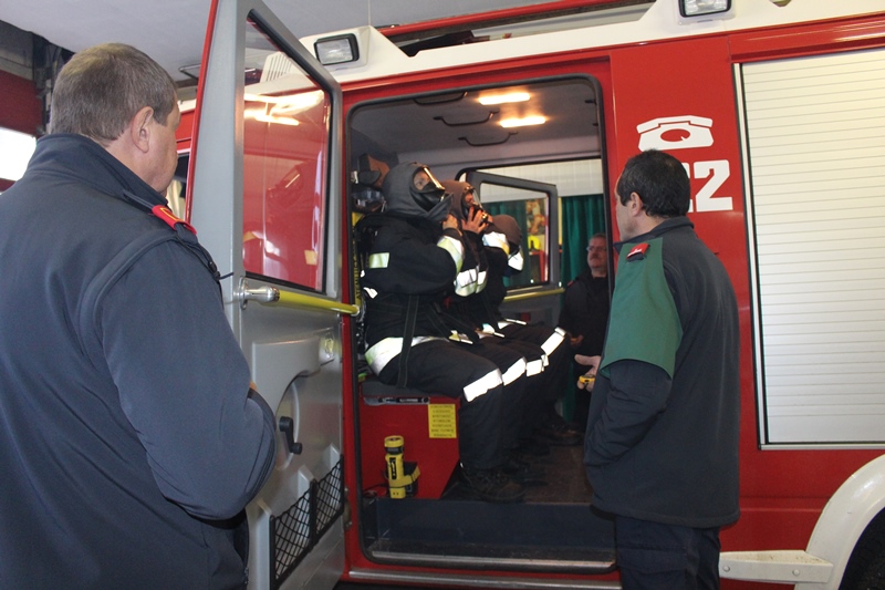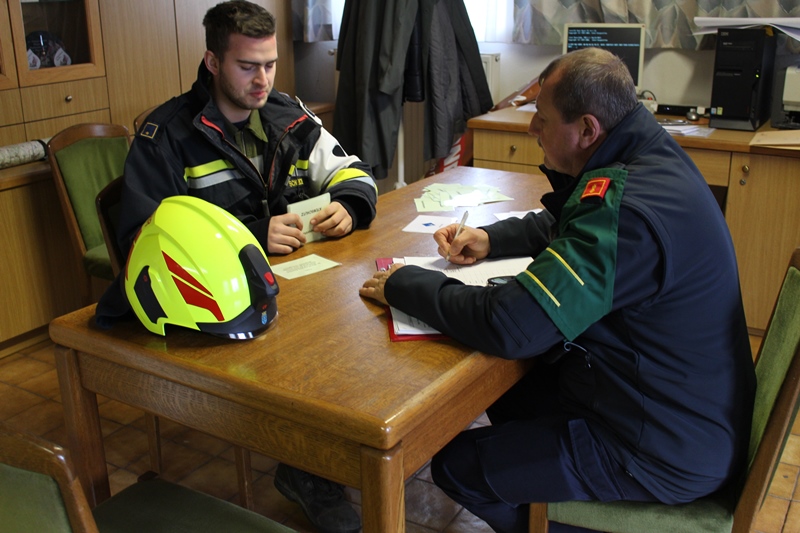 4. Station (Geräteversorgung): Bei dieser Station muss der Trupp die Geräte wieder richtig Einsatzbereit machen. Das bedeutet, die einzelnen Truppmitglieder müssen die leeren Atemschutzflaschen wechseln, zum Atemschutzsammelplatz bringen, anschließend die vollen Flaschen wieder einsetzten und danach eine Hochdruckdichtprüfung des ATS-Gerätes durchführen. Während die Truppmitglieder die Geräte versorgten, musste der Gruppenkommandant von 35 vorgegebenen Fragen 15 ziehen und diese richtig beantworten. |