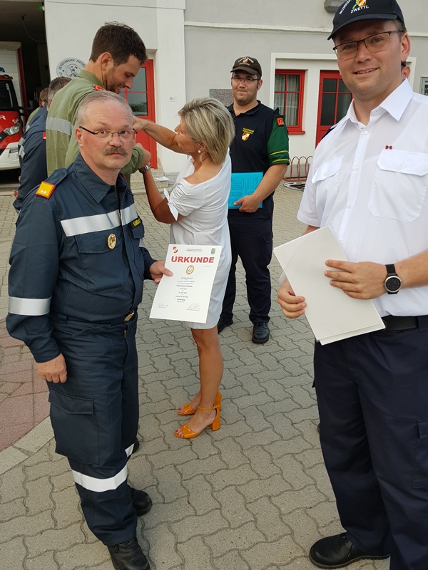 Hauptprüfer HBI Franz Thaler gratulierte allen Teilnehmern zur bestandenen Ausbildungsprüfung, im Namen des Bezirksfeuerwehrkommandos Zwettl zählten BFKDTSTV Karl Kainrath und VR Ewald Litschauer zu den Gratulanten und konnte anschließend die Abzeichen gemeinsam mit Bgm. Silvia Riedl-Weixlbraun übergeben.