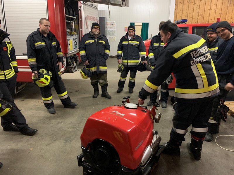 Zu Beginn der Schulung wurde im Feuerwehrhaus die Bedienung der Tragkraftspritze als auch jene der Einbaupumpe des RLFA theoretisch durchgesprochen und die jeweiligen Handgriffe durchgegangen, bevor man sich mit dem RLFA 2000 und dem LFA ins Betriebsgebiet Nord begab. Beim Bahnbrunnen angelangt, wurde zuerst die Tragkraftspritze aus dem LFA gehoben, ehe HBM Thomas Weidenauer Schritt für Schritt die Handgriffe bei der Bedienung der Tragkrafspritze erklärte.