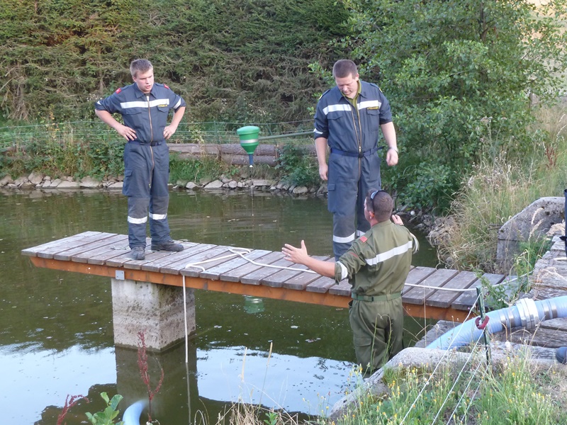 Nach der Begrüßung durch ABI Christian Hübl teilten sich die Mitglieder in die Fahrzeuge auf und fuhren mit dem RLFA 2000, KDOF, LFA und der SPA200 zu einer Teichanlage im Gemeindegebiet von Göpfritz/Wild.