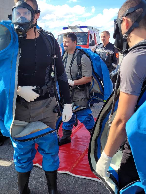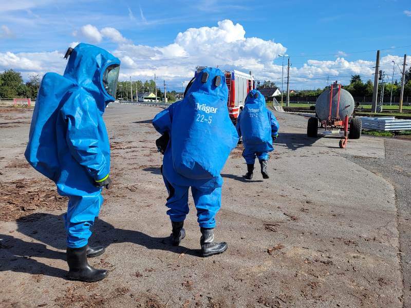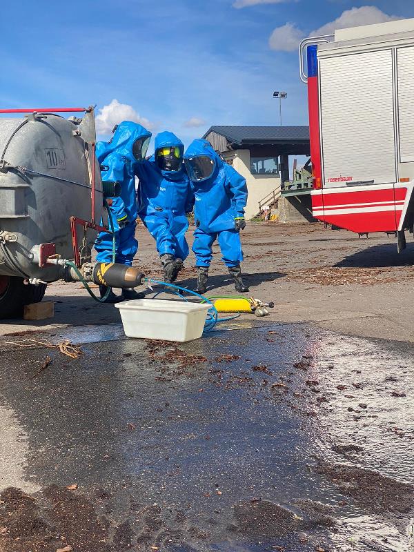 Ziel dieser Übung war es, die Gerätschaften des Schadstoffcontainers kennenzulernen sowie das Arbeiten mit Schutzanzügen der Stufe 3 zu erproben.