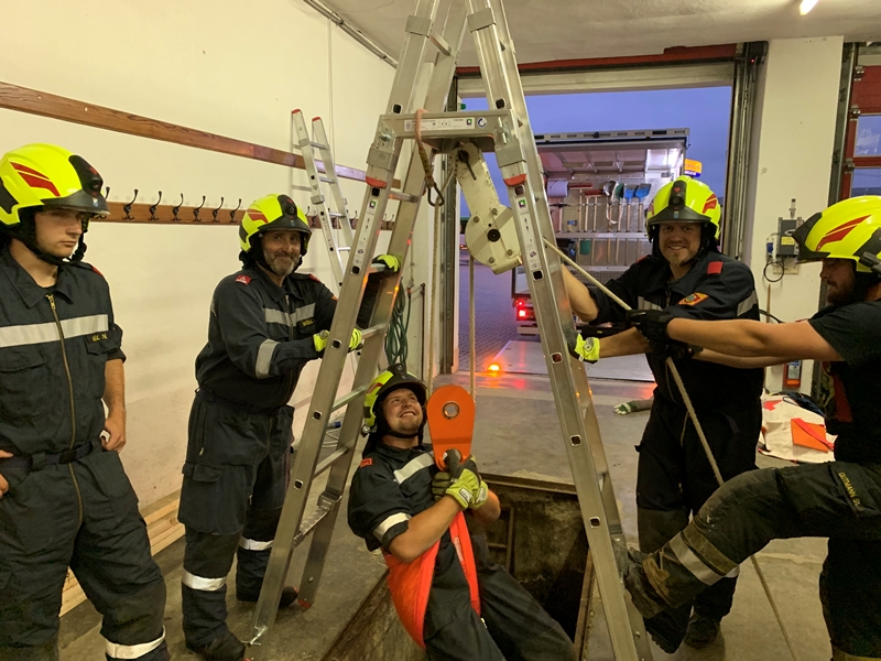 Neben dieser Art der Verwendung, kann die Steckleiter auch mit einem Verbindungsteil verbunden werden. Dadurch ist es möglich Personen mit einer Art "Dreibein-Konstruktion" aus Tiefen zu retten. Genau diese Verwendung der Steckleitern wurde an diesem Freitag intensiv beübt, um beispielsweise eine Person aus einem Schacht retten zu können.