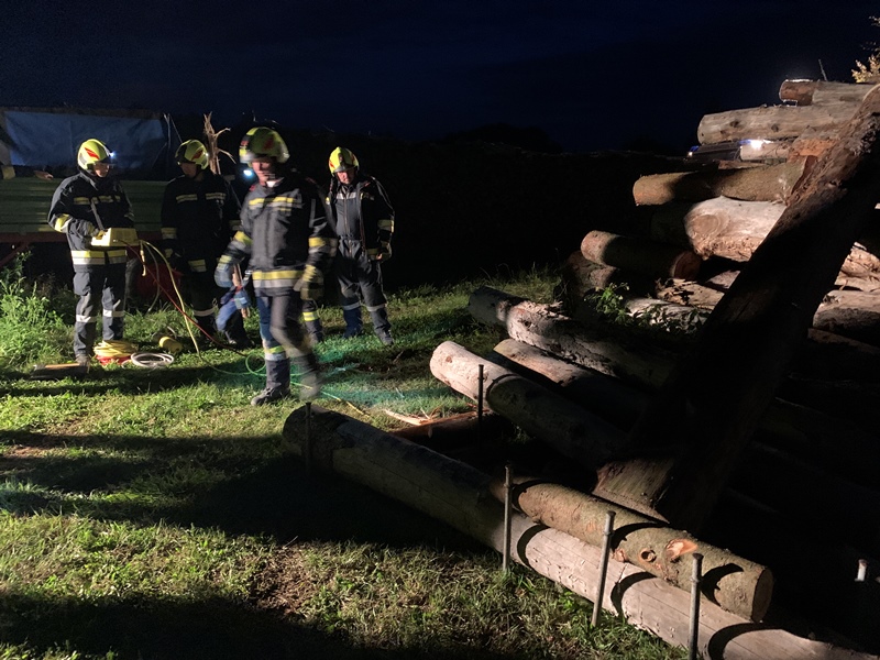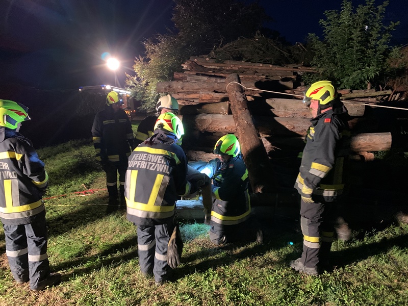 Nachdem sich die Feuerwehrmitglieder im Feuerwehrhaus getroffen haben, machten sie sich auf den Weg zum Übungszenario. Bei der Erkundung durch den GRKDT des RLFA 2000 HBM Thomas Weidenauer konnte von diesem festgestellt werden, dass eine Person unter einem Rundholzhaufen eingeklemmt und beinahe vollständig verschüttet war.
