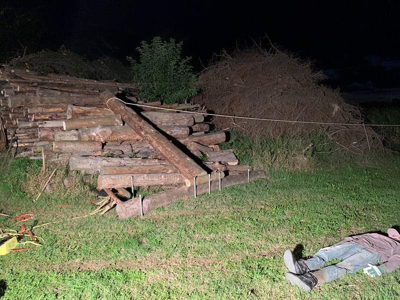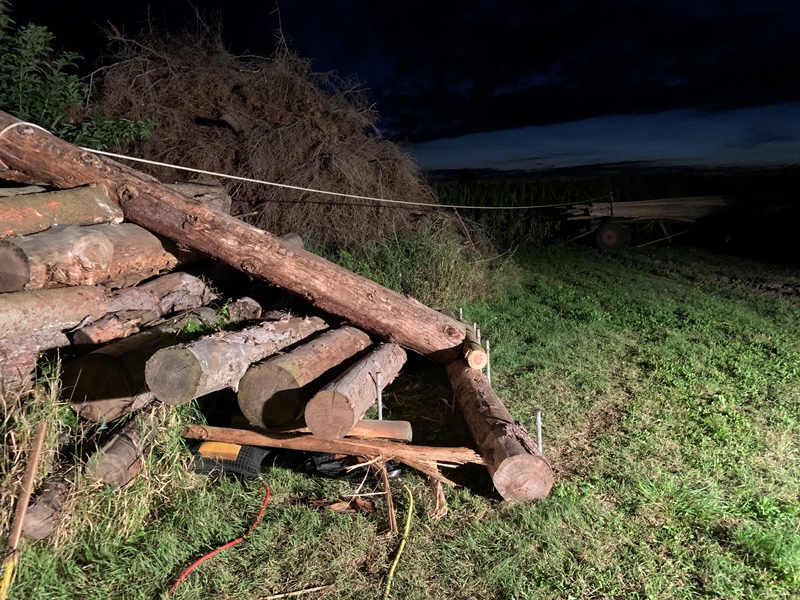 Unter der Zuhilfenahme der Erdnägel der Freilandverankerung des Greifzuges konnte rasch eine Sicherung der Rundhölzer vorgenommen werden und somit mit der Rettung der Person begonnen werden. Dafür wurden die Hebekissen im Zwischenraum (Boden & Hölzer) aufgelegt und in weiterer Folge konnten die Hölzer ohne Mühen Stück für Stück angehoben und die Person gerettet werden.
