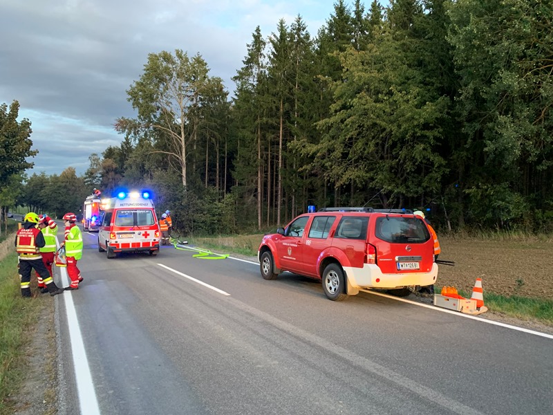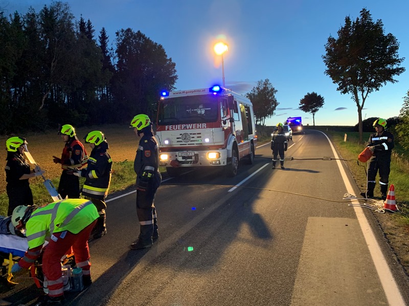 Annahme war ein Verkehrsunfall mit einer vermutlich eingeklemmten Person auf der L55 zwischen Schönfeld und Groß Siegharts - dieses Szenario entspricht der Alarmstufe T2 - bei dieser Alarmstufe arbeiten die Feuerwehren Groß-Sieharts-Stadt und Göpfritz/Wild auf diesem Straßenabschnitt auch im Einsatzfall immer wieder eng zusammen.