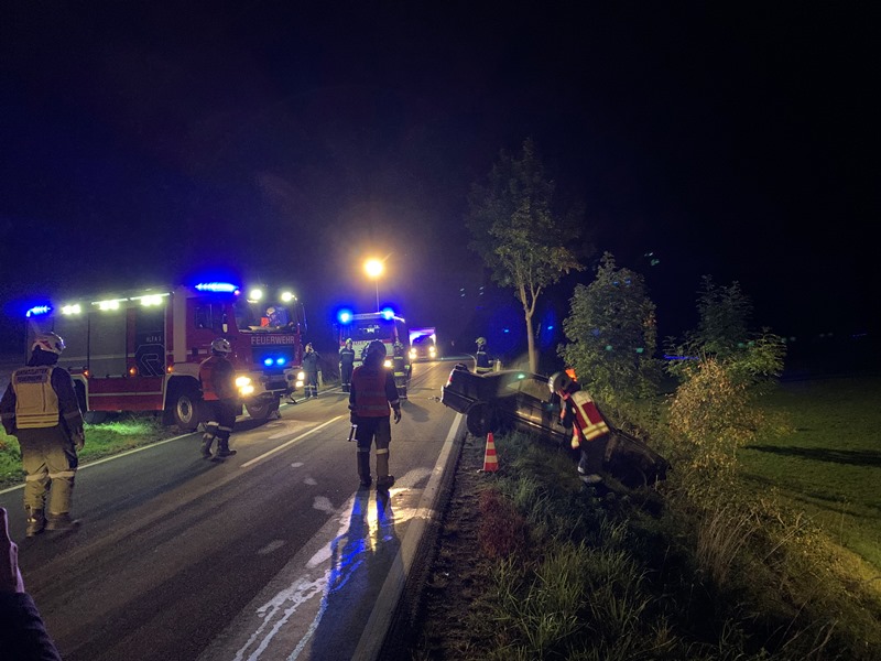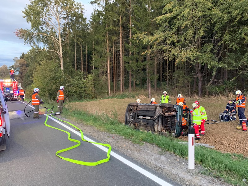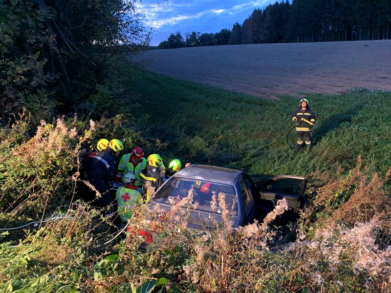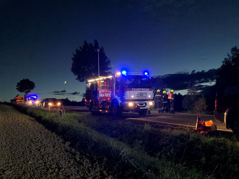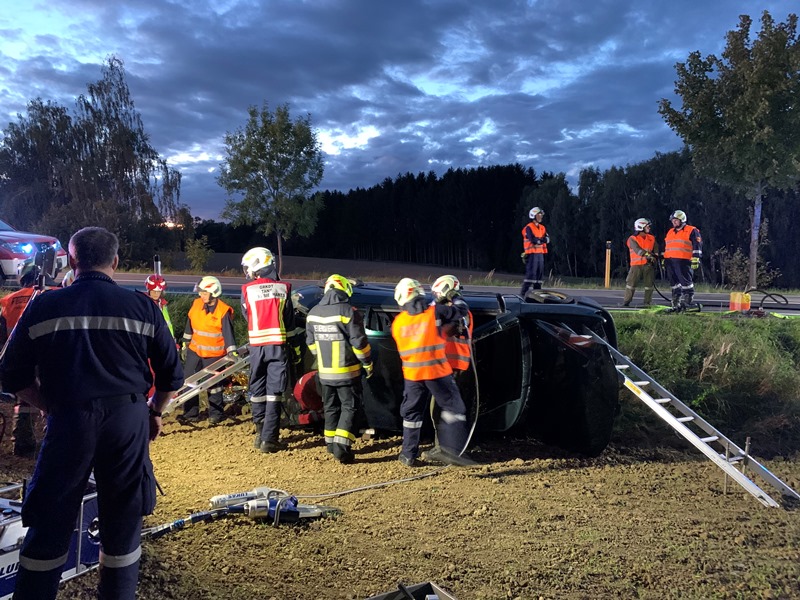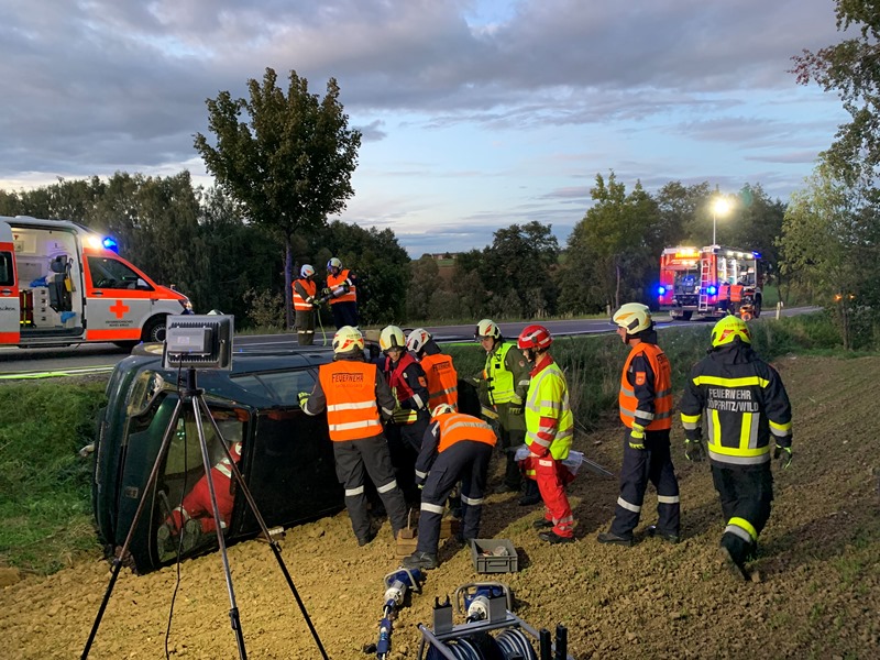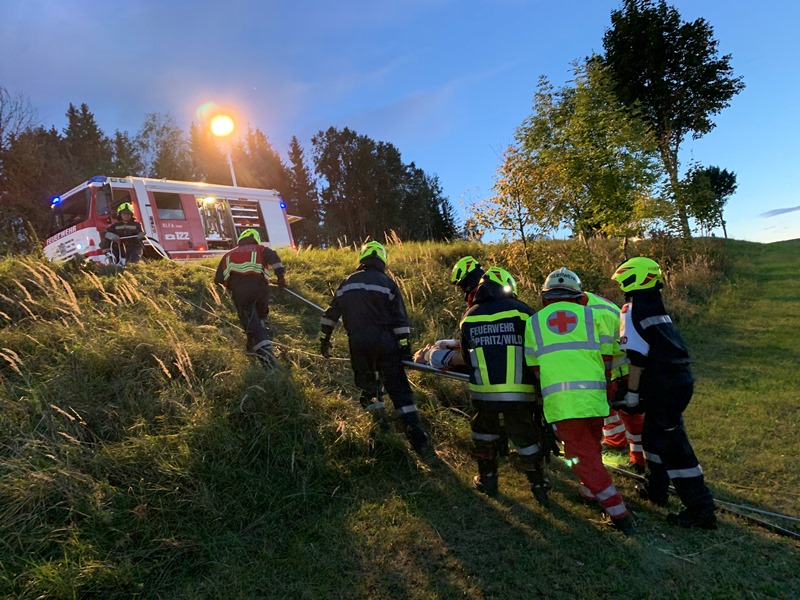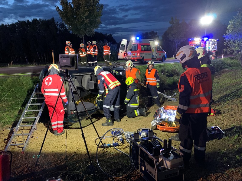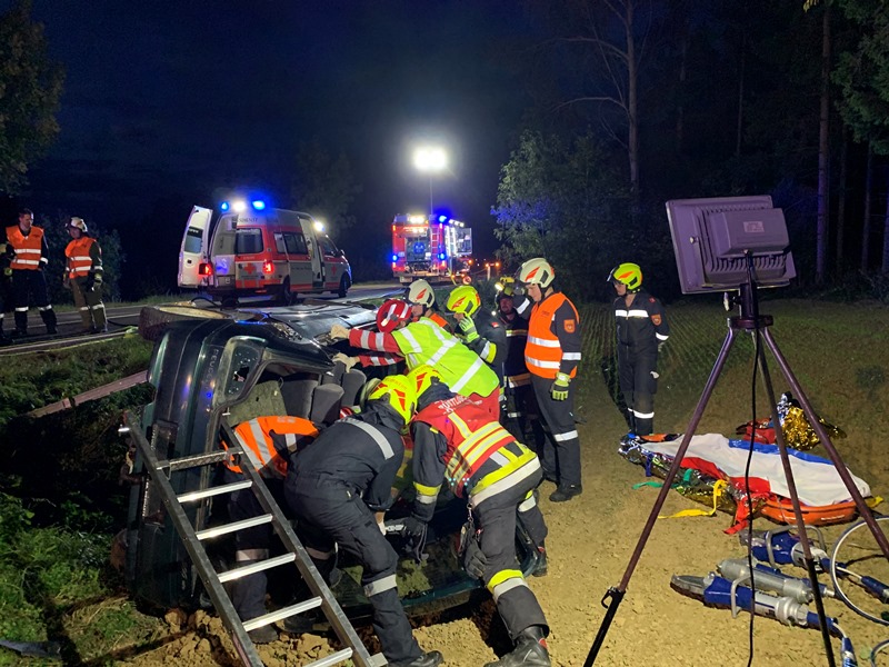 Die eingesetzen Mitglieder des RLFA und des VF´s bauten in weiterer Folge eine Beleuchtung sowie den Brandschutz auf und stellten die Betreuung der im Fahrzeug befindlichen Person bis zum Eintreffen des Rettungsdienstes sicher. Nach Eintreffen des Rettungsdienstes konnte die Person gemeinsam aus dem Fahrzeug befreit und über die steile Böschung bis zum RTW transportiert werden.