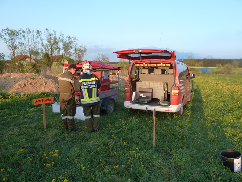 Die Feuerwehr Göpfritz/Wild wurde nach dem Eintreffen am Einsatzort mit der Brandbekämpfung der Glutnester in der Halle, mit der Suche nach den vermissten Personen in der Halle sowie mit dem Aufbau und Leitung des Atemschutzsammelplatzes beauftragt. Sofort begann sich ein Atemschutztrupp des RLFA 2000 auszurüsten und begann mit der Brandbekämpfung bzw. Menschensuche in der Halle. Die Besatzung des LFA Göpfritz begann die Zubringleitung für das RLFA Göpfritz aufzubauen und half damit den Kameraden der Feuerwehr Weinpolz. Der Atemschutzsammelplatz wurde durch die Besatzung des KDOF aufgebaut und in weiterer Folge wurden 18 Atemluftflaschen wieder befüllt.