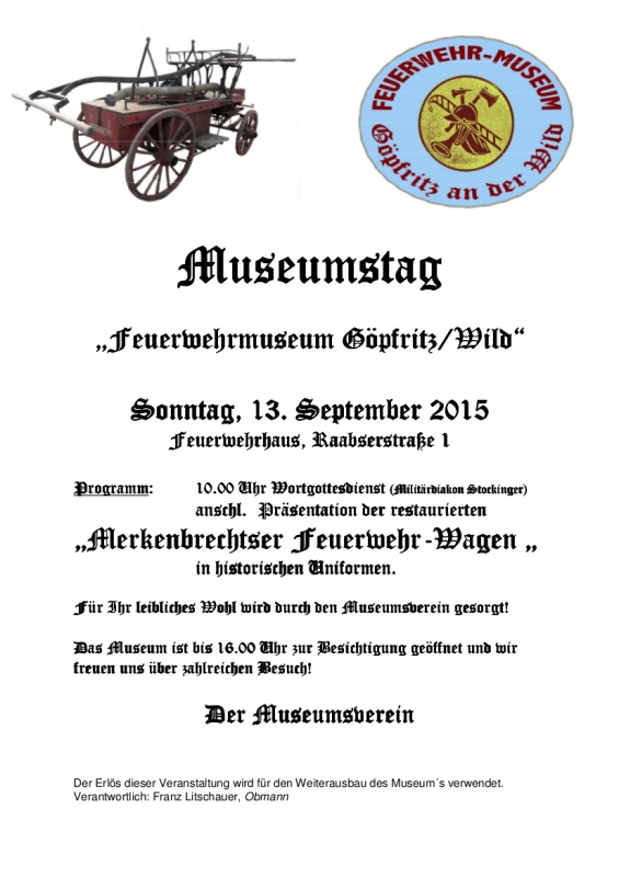 Der Museumsverein Göpfritz an der Wild lädt recht herzlich zum 1. Museumstag am 13. September 2015 ins Feuerwehrhaus in Göpfritz ein.