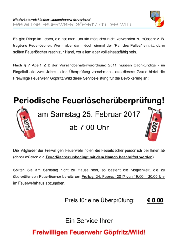 Alle zwei Jahre (zuletzt im März 2015) wird von der Freiwilligen Feuerwehr Göpfritz/Wild die periodische Feuerlöscherüberprüfung durchgeführt. Zwei Jahre deshalb, da ein Feuerlöscher alle zwei Jahre auf seine Funktionstüchtigkeit hin geprüft werden muss.