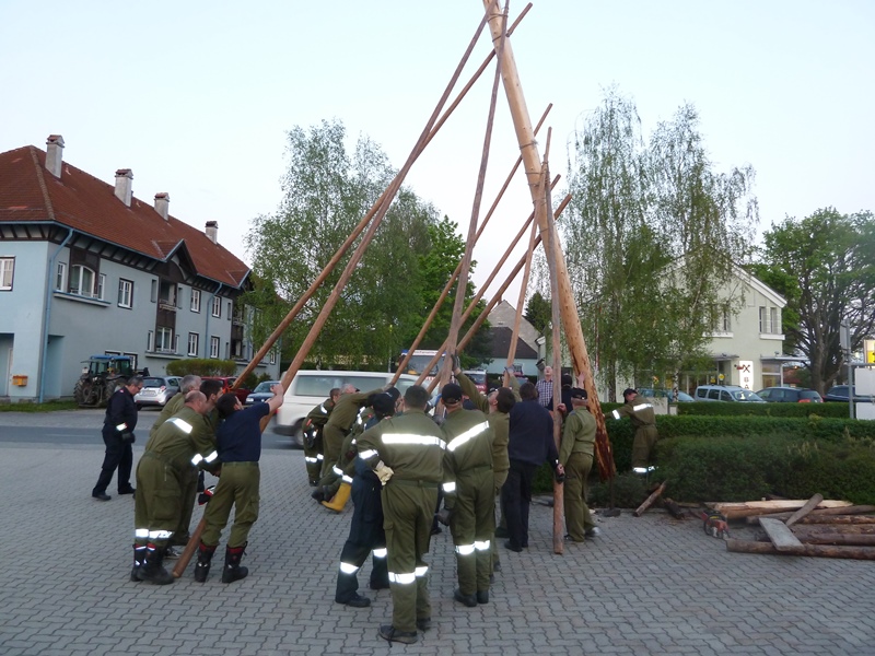Der Maibaum, welchen dieses Jahr die Familie Biwan zur Verfügung stellte, wird aus Tradition mit reiner Muskelkraft aufgestellt. Es werden nur "Schwabler" zu Hilfe genommen, außer bei Schlechtwetter (Regen) wird ein Traktor bzw. Bagger zur Unterstützung herangezogen.