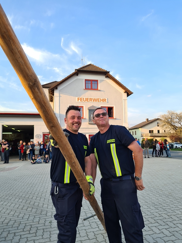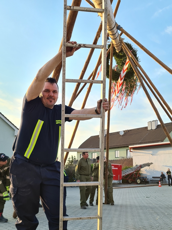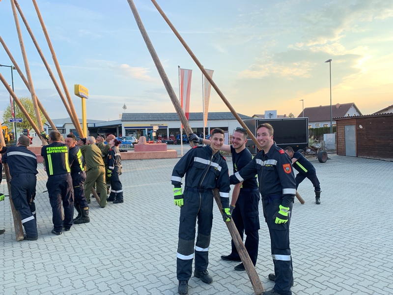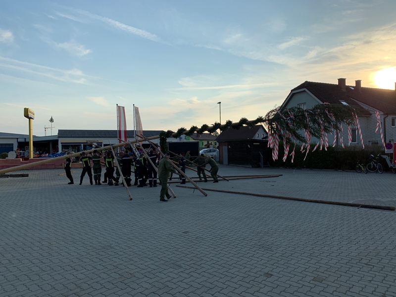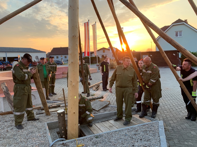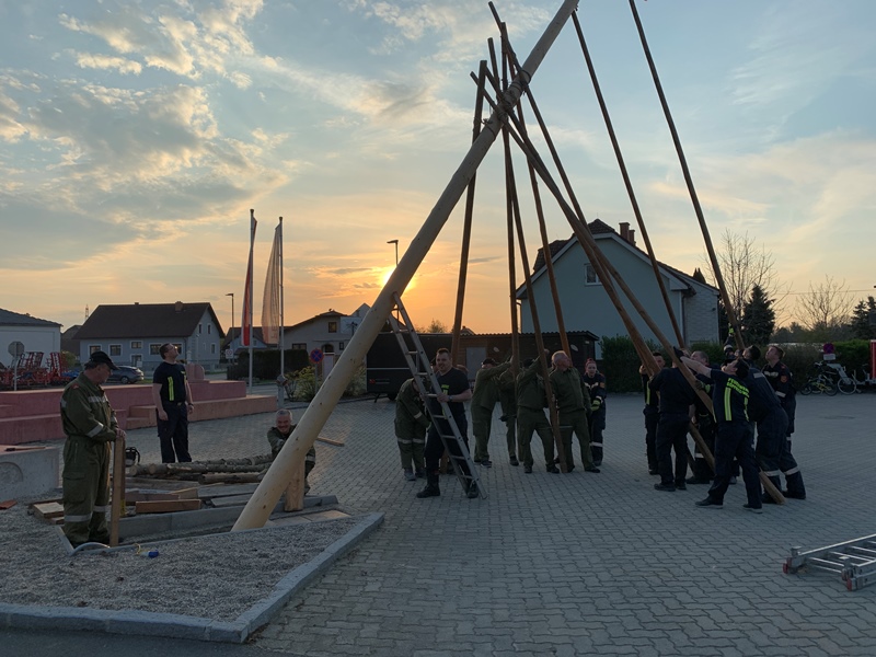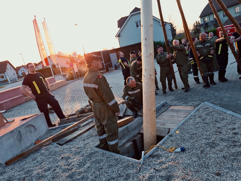 Nach über eineinhalb Stunden harter Arbeit ragte der Baum bei sonnigem Wetter in den Himmel und wird während des gesamten Monats Mai den "Platz der vergessenen Feuerwehren" in Göpfritz/Wild sowie den gesamten Ort zieren.