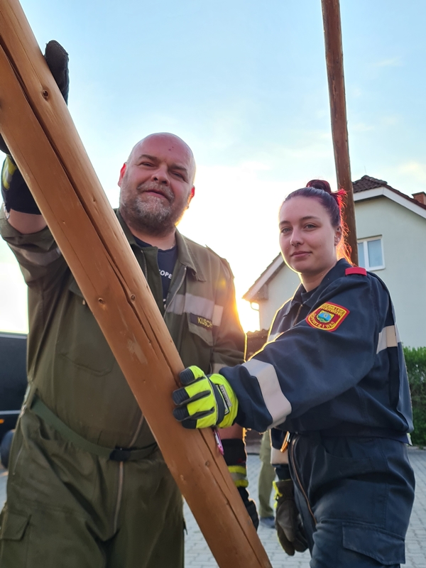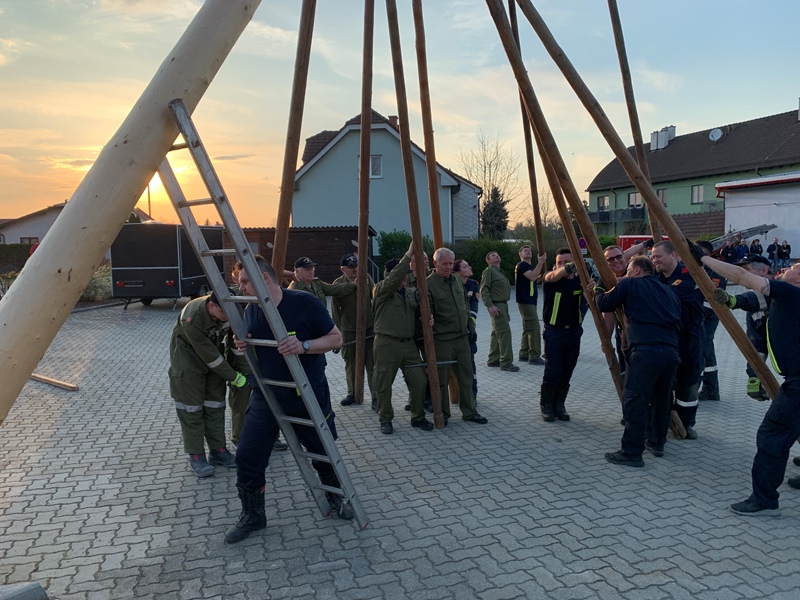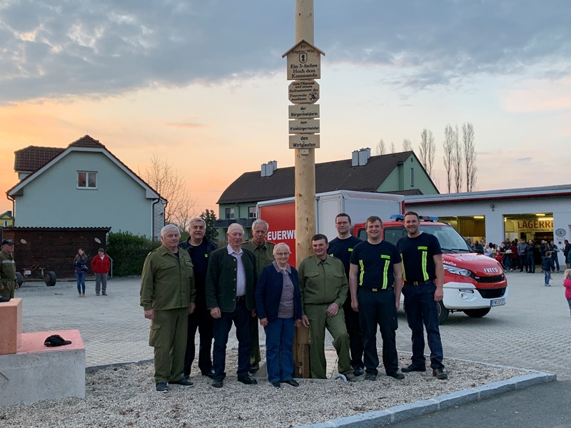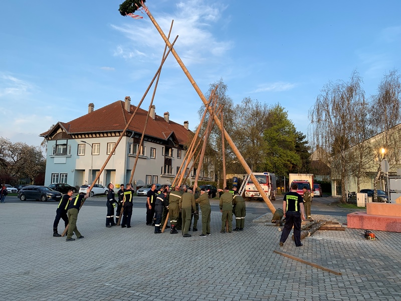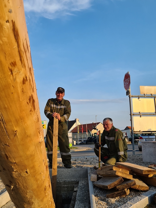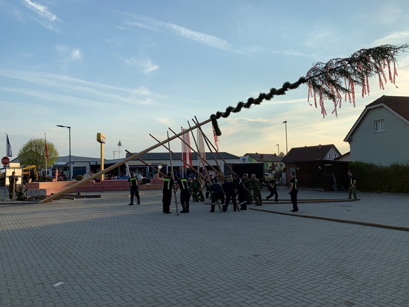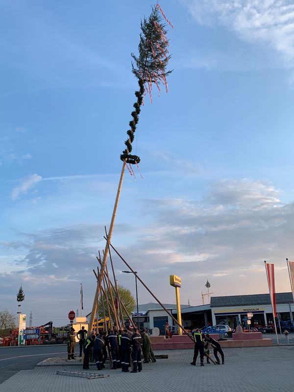 Nach über eineinhalb Stunden harter Arbeit ragte der Baum bei sonnigem Wetter in den Himmel und wird während des gesamten Monats Mai den "Platz der vergessenen Feuerwehren" in Göpfritz/Wild sowie den gesamten Ort zieren.
