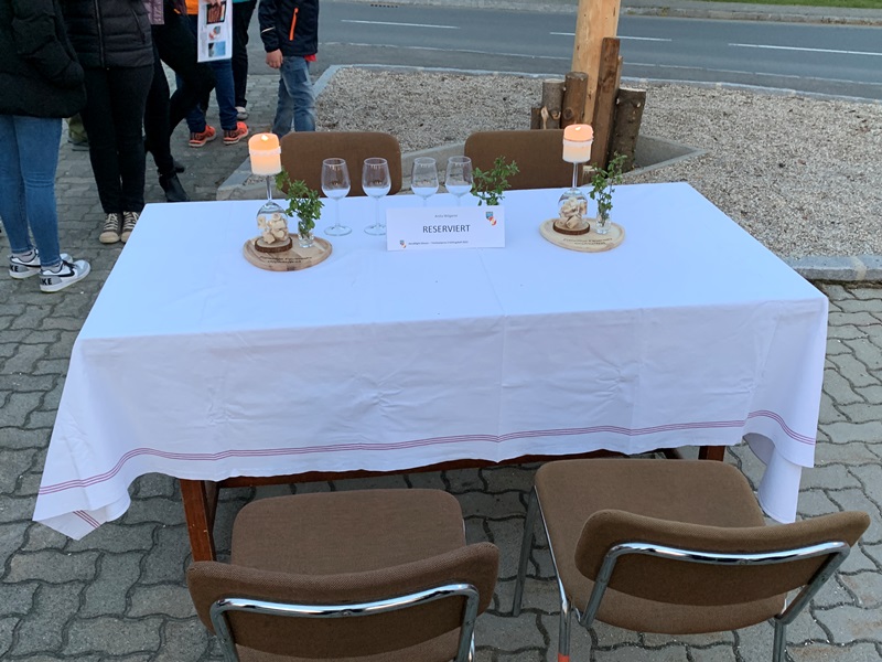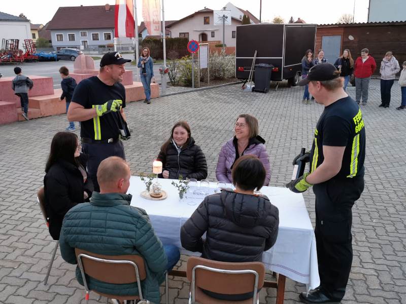 Dort wartete bereits das gesamte Feuerwehrkommando um Feuerwehrkommandant BR Christian Hübl, seinem Stellvertreter OBI Franz Steinbauer und dem Leiter des Verwaltungsdienstes VR Ewald Litschauer. Ebenso hat sich bereits ein Teil der Bevölkerung vor dem Feuerwehrhaus eingefunden um sich dieses Spektakel, so wie die Jahre vor der Pandemie, anzusehen.