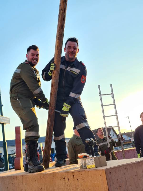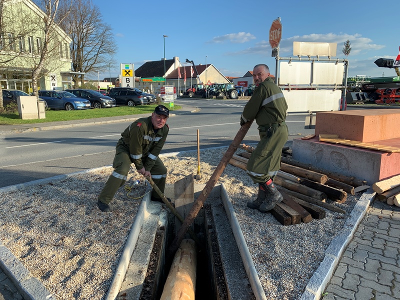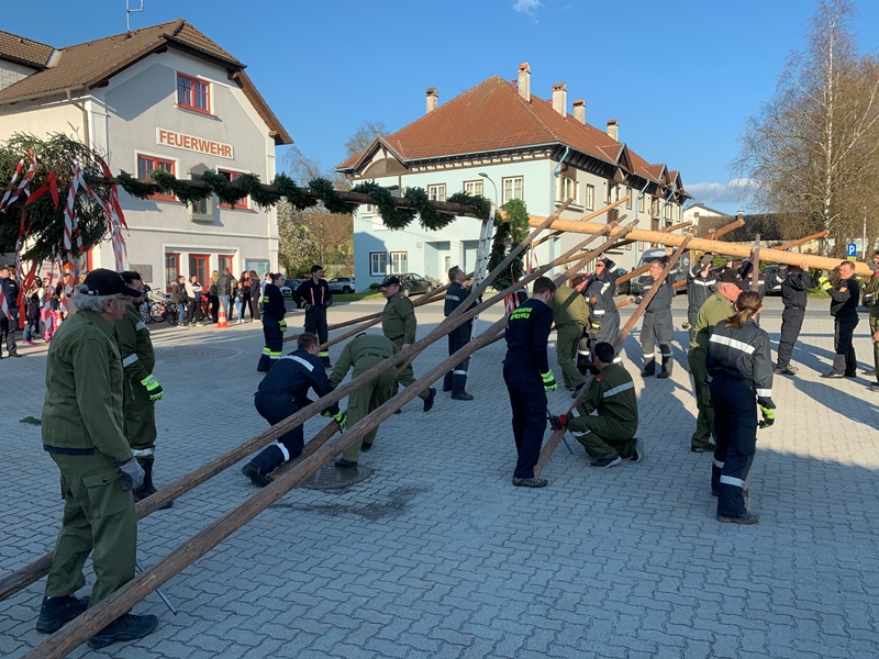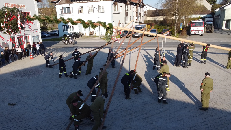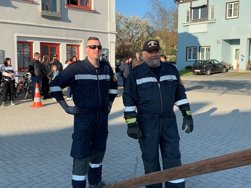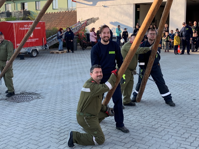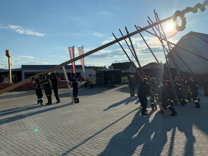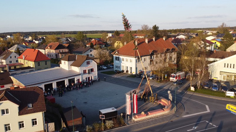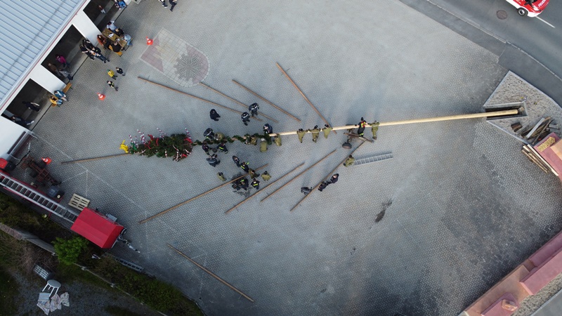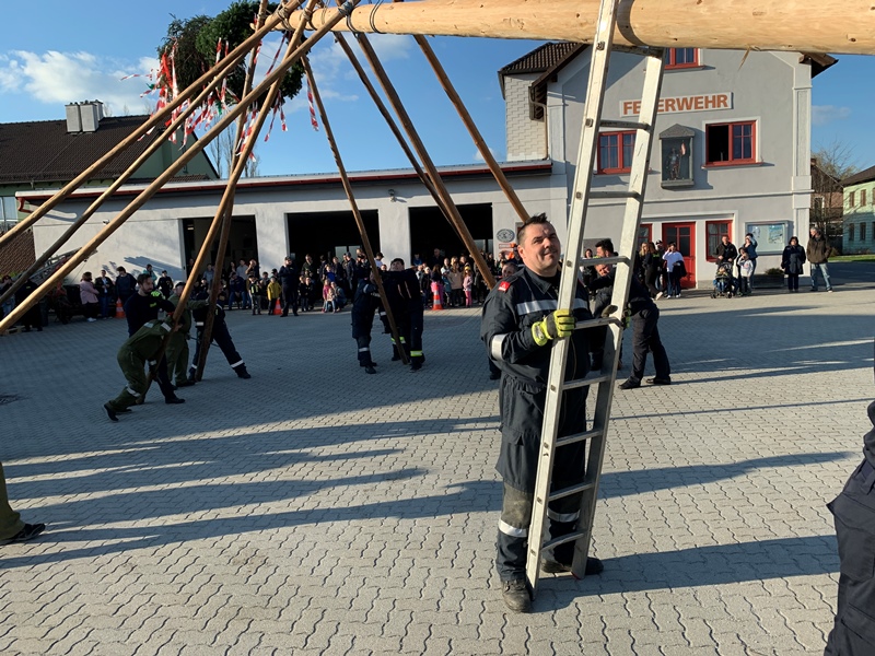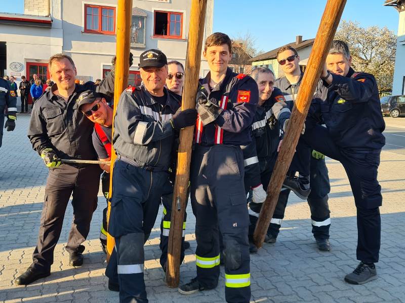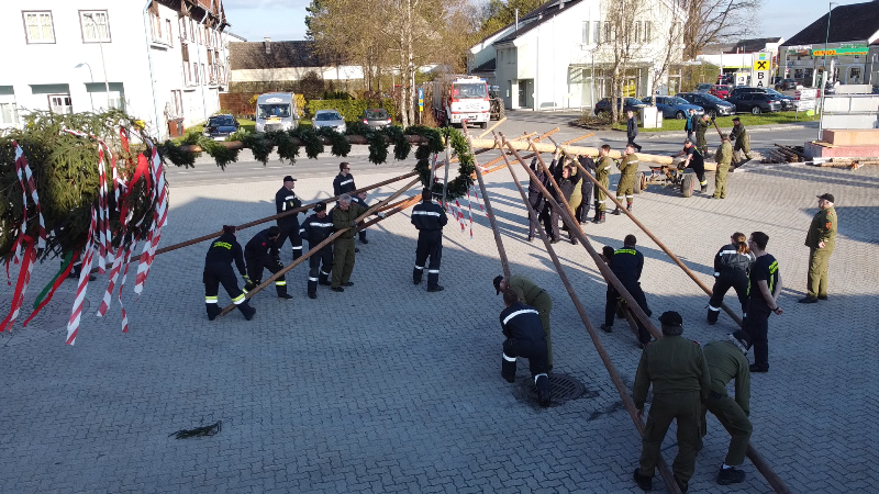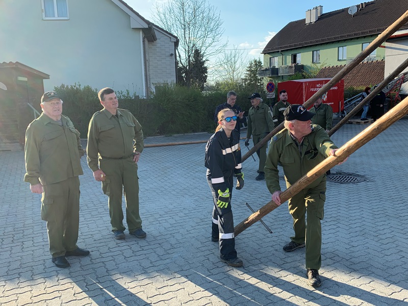 Nach über eineinhalb Stunden harter Arbeit ragte der Baum bei sonnigem Wetter in den Himmel und wird während des gesamten Monats Mai den "Platz der vergessenen Feuerwehren" in Göpfritz/Wild sowie den gesamten Ort zieren.