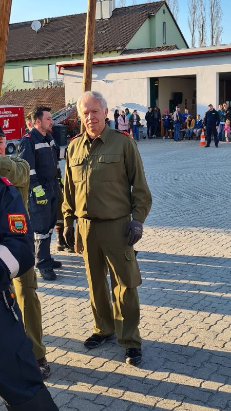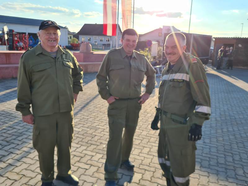 Dort wartete bereits das gesamte Feuerwehrkommando um Feuerwehrkommandant BR Christian Hübl, seinem Stellvertreter OBI Franz Steinbauer und dem Leiter des Verwaltungsdienstes VR Ewald Litschauer. Ebenso hat sich bereits ein Teil der Bevölkerung vor dem Feuerwehrhaus eingefunden um sich dieses Spektakel anzusehen.
