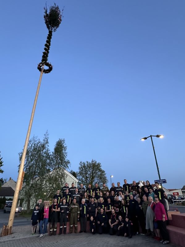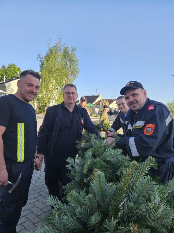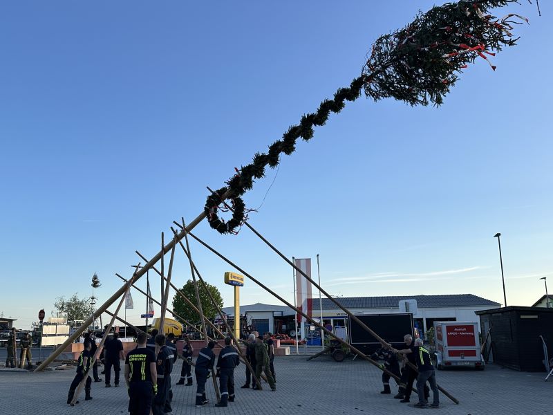 Nach über eineinhalb Stunden harter Arbeit ragte der Baum bei sonnigem Wetter in den Himmel und wird während des gesamten Monats Mai den "Platz der vergessenen Feuerwehren" in Göpfritz/Wild sowie den gesamten Ort zieren.