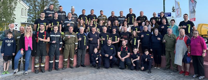 Dort wartete bereits das gesamte Feuerwehrkommando um Feuerwehrkommandant HBI Stefan Gutmann, seinem Stellvertreter HBI Franz Steinbauer und dem Leiter des Verwaltungsdienstes OV Patrick Schneider. Ebenso hat sich bereits ein Teil der Bevölkerung vor dem Feuerwehrhaus eingefunden um sich dieses Spektakel anzusehen.