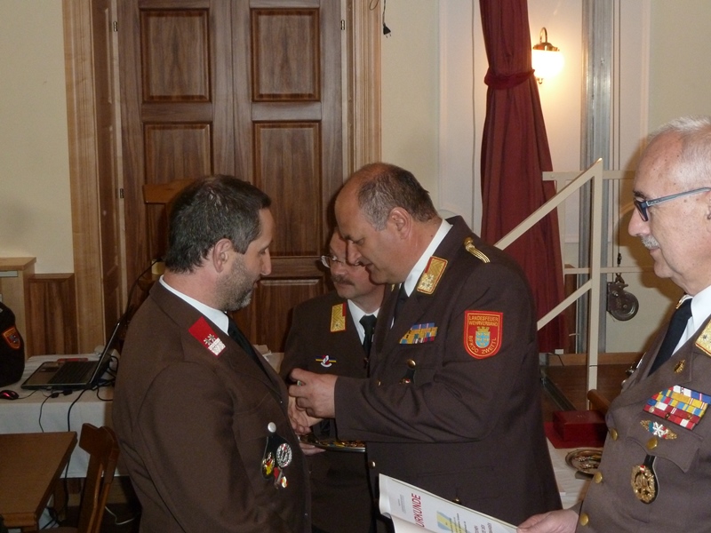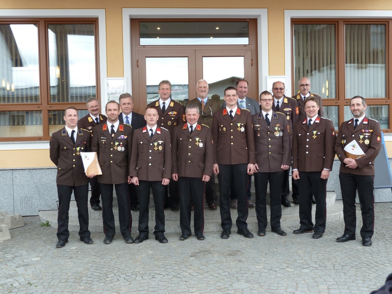 LAbg. Franz Mold überreichte in Vertretung von Landeshauptmann Dr. Erwin Pröll sowie im Beisein von Bezirkshauptmannes Dr. Michael Wiedermann sowie ranghohen Feuerwehrfunktionären wie LFR Erich Dangl und Bezirksfeuerwehrkommandant OBR Franz Knapp, Auszeichnungen des Landes Niederösterreichs für 50, 40 und 25 Jahre verdienstvolle Tätigkeit auf dem Gebiete des Feuerwehr- und Rettungswesens.