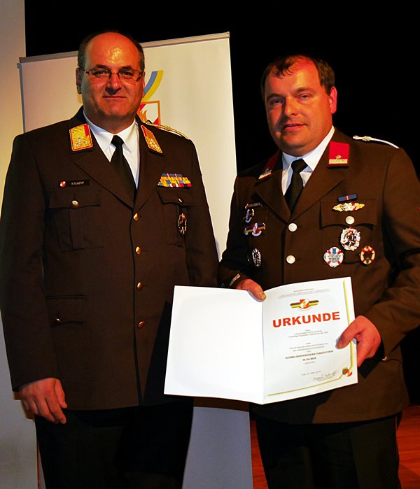 Bezirksfeuerwehrkommandant OBR Franz Knapp konnte zwei Mitglieder aus der Feuerwehr Göpfritz für ihre oftmalige und langjährige Tätigkeit als Lehrbeauftragte im Bezirk Zwettl mit dem Ausbilderverdienstabzeichen in Silber und Gold auszeichnen.