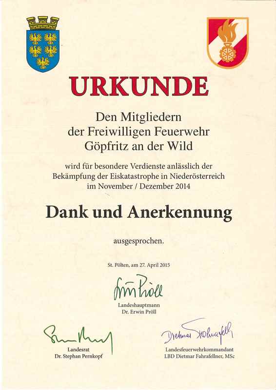 Seitens der Freiwilligen Feuerwehr Göpfritz/Wild konnte Kommandant ABI Christian Hübl, stellvertretend für alle eingesetzten Mitglieder, die Urkunde entgegen nehmen.