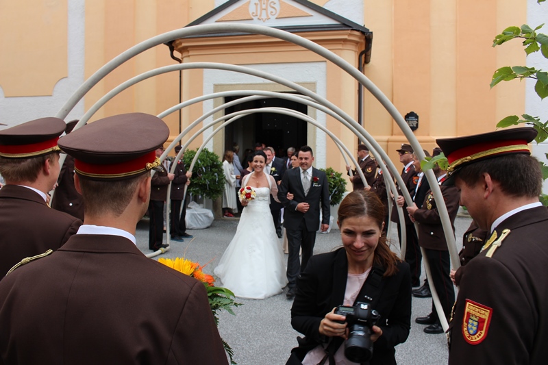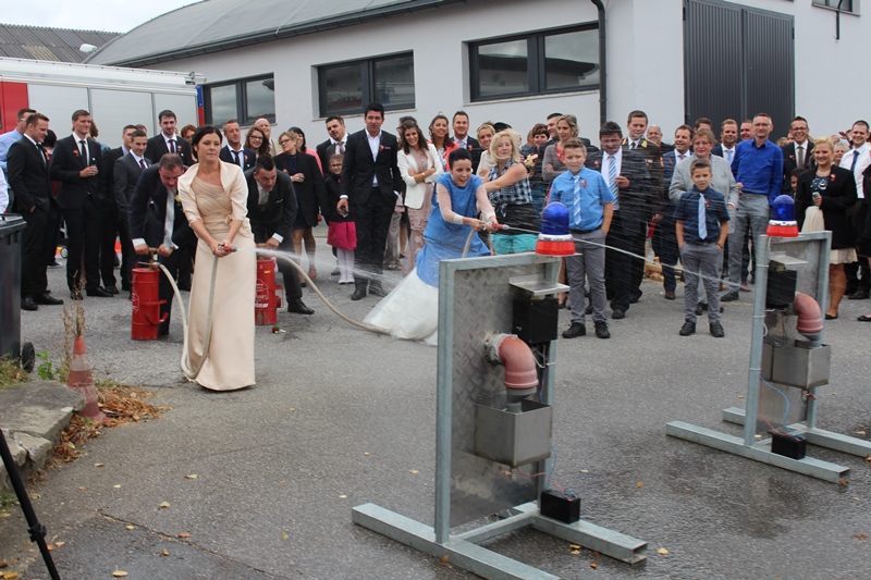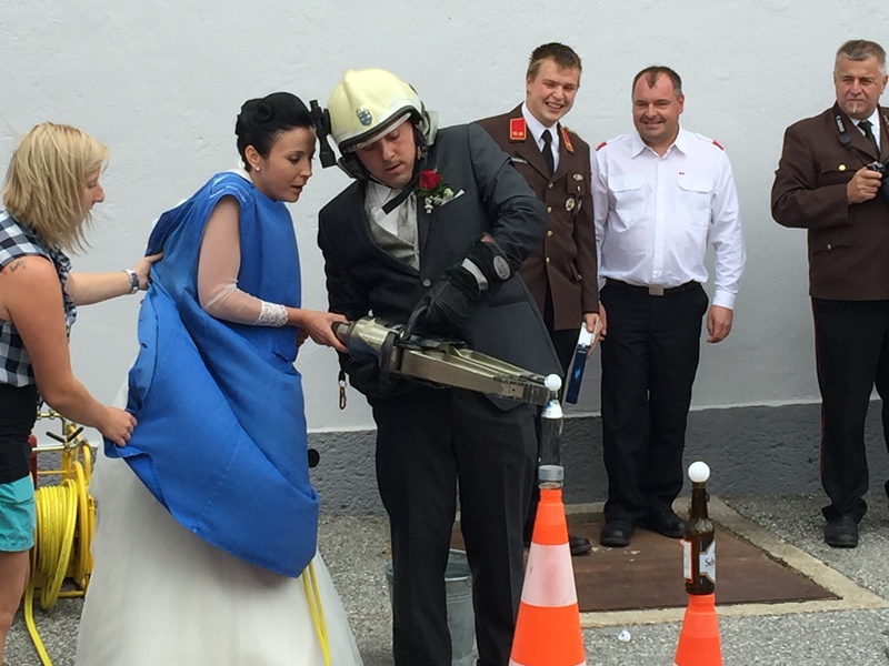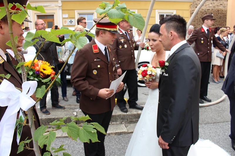 Die Mitglieder der FF Göpfritz/Wild empfingen das frisch vermählte Brautpaar mit einer Schlauchbogen-Spalier.