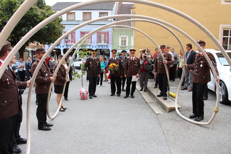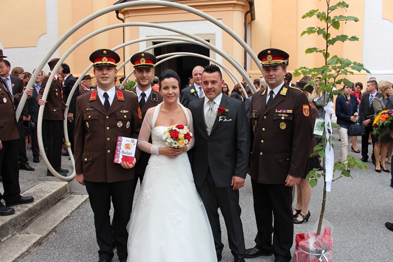 Nach dem Auszug aus der Kirche - durch den Schlauchbogen - überreichte das Feuerwehrkommando, stellvertretend für alle Mitglieder der Feuerwehr Göpfritz eine Linde, welche der "Hochzeitsbaum" an diesem Tag ist, an das Brautpaar.