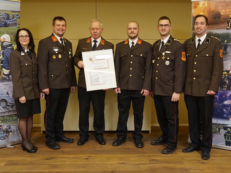 Aufgrund des Ausscheidens des Feuerwehrkommandanten sowie des Leiter des Verwaltungsdienstes aus ihren Funktionen bedankte sich das neue Feuerwehrkommando mit einem Präsent sowie mit der Verleihung der Ehrendienstgrade für die bisher ausgeübten Funktionen.