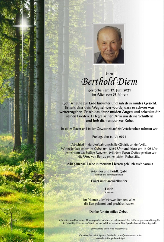 Die Beisetzung findet am Freitag, dem 2. Juli 2021 um 14.00 Uhr
