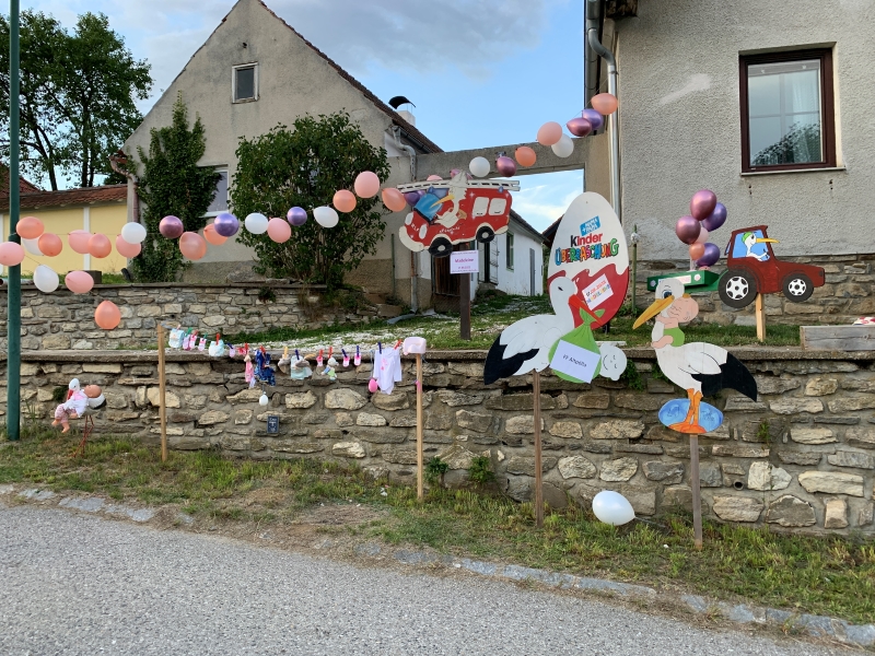 Aus diesem Grund rückten die Mitglieder der Feuerwehr Göpfritz/Wild am Abend des 19. August 2022 zu einem "Einsatz" der besonderen Art aus und überbrachten ihre Glückwünsche symbolisch mit einem Storch, welcher vor dem Haus aufgestellt wurde.