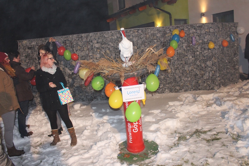 Rund 40 Mitglieder der Feuerwehr Göpfritz/Wild rückten daher besonders erfreut am Abend des 03. Februar zu einem "Einsatz" der besonderen Art aus und überbrachten ihre Glückwünsche symbolisch mit einem Storch, welcher im Garten vor dem Haus aufgestellt wurde.