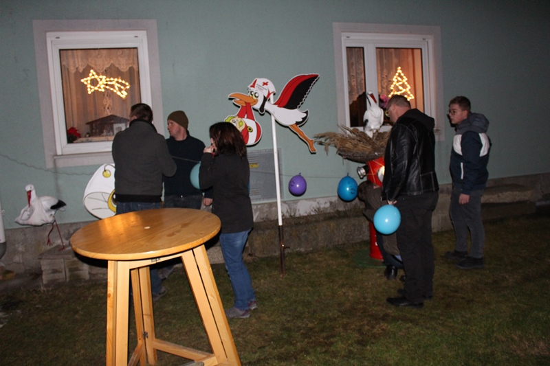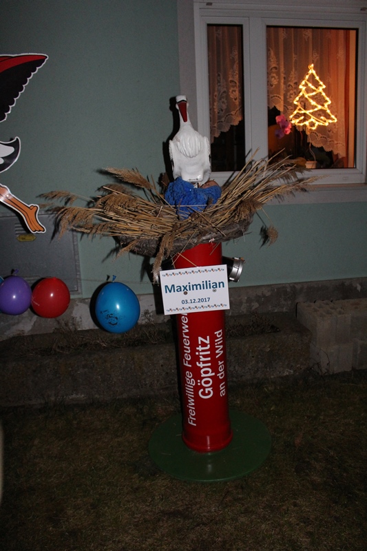 Aus diesem Grund rückten die Mitglieder der Feuerwehr Göpfritz/Wild besonders erfreut am Abend des 15. Dezember 2017 zu einem "Einsatz" der besonderen Art aus und überbrachten ihre Glückwünsche symbolisch mit einem Storch, welcher im Garten vor dem Haus aufgestellt wurde.