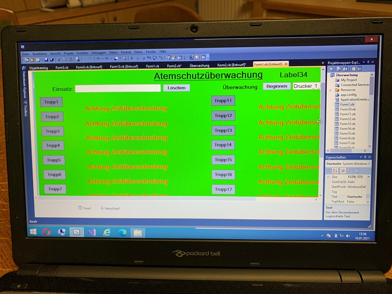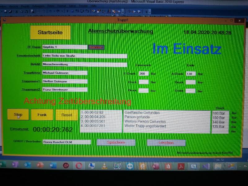Während eines Atemschutzeinsatzes ist es erforderlich, die eingesetzten Atemschutztrupps zu dokmentieren, damit deren maximale Einsatzdauer nicht überschritten wird. Diese Dokumentation wird bei größeren Ereignissen eine Herausforderung, da man hier leicht die Übersicht der eingesetzten Truppes verlieren kann. Um diese Dokumentation übersichtlicher zu gestalten, programmierte OLM Ronny Kuschal ein entsprechendes Programm, welches nun der Feuerwehr Göpfritz/Wild zur Verfügung steht.