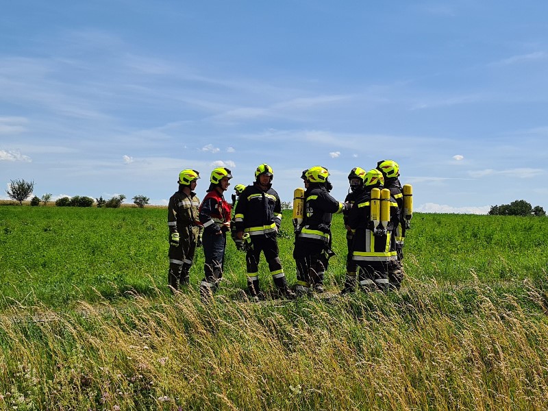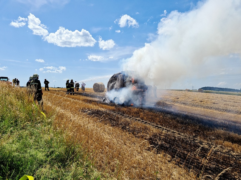 Bereits vier Minuten nach der Alarmierung rückten die ersten der insgesamt 15 eingesetzten Mitglieder der Freiwilligen Feuerwehr Göpfritz/Wild mit dem RLFA 2000 und LFA sowie der Wärmebildkamera zur angegebenen Einsatzadresse in Weinpolz zum Brand einer Rundballenpresse aus.