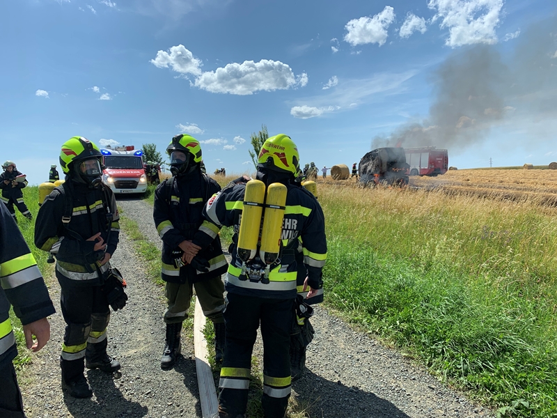 Aufgrund der Notrufmeldung (Brand Rundballenpresse) wurde sofort Alarmstufe 2 ausgelöst, aus diesem Grund wurden neben der örtlich zuständigen Feuerwehr Weinpolz auch die Freiwilligen Feuerwehren Göpfritz/Wild, Waldberg-Matzlesschlag, Scheideldorf und Windigsteig alarmiert.