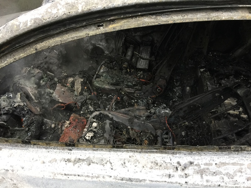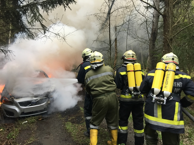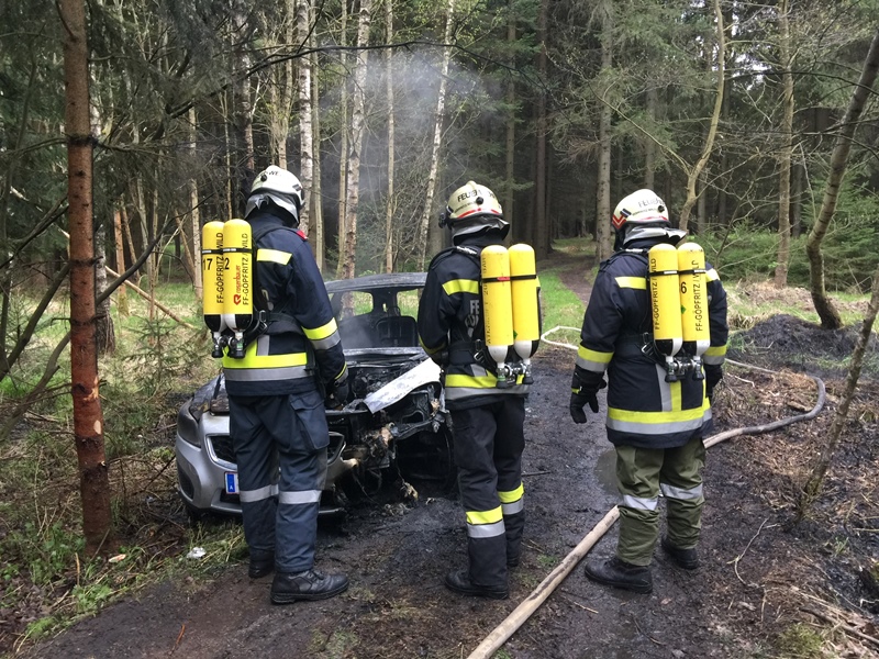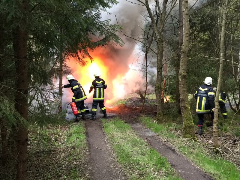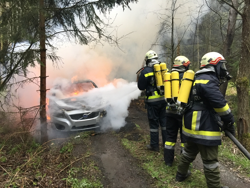 Bei einem in Vollbrand stehendem Fahrzeug drohten die Flammen auf den angrenzenden Wald überzugreifen.