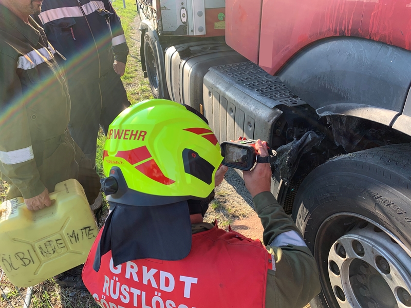Anschließend wurde der LKW, nach Absprache mit der ebenfalls anwesenden Polizei, zu einem Abstellplatz begleitet und nochmals mit der Wärmebildkamera auf etwaige Glutnester untersucht und auslaufende Betriebsmittel aufgefangen.