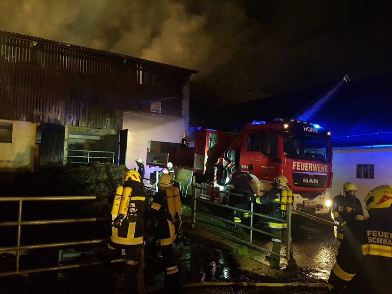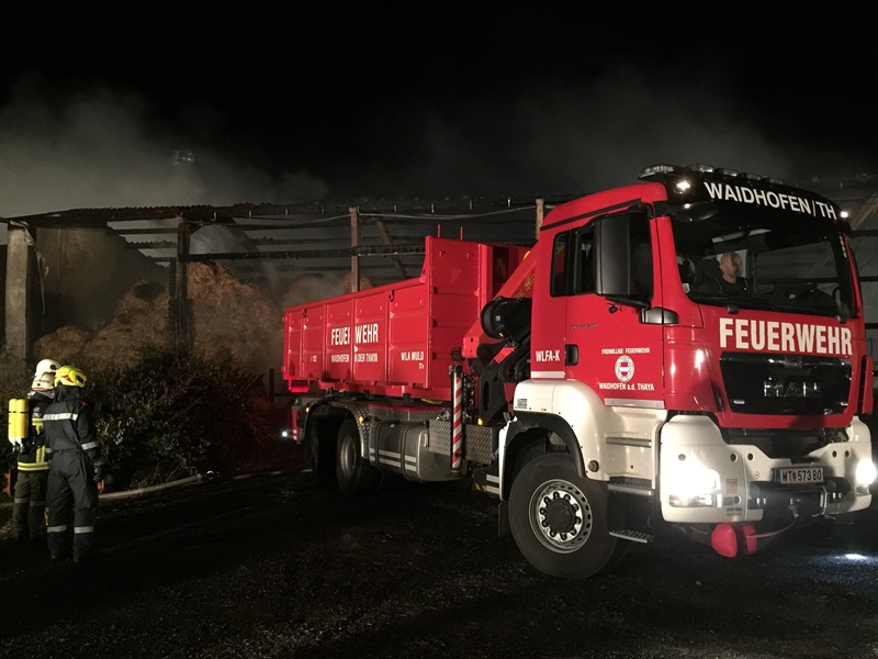 Die Einsatzleitung forderte in weiterer Folge auch die Wechselladefahrzeuge (Kran und Mulde) der Feuerwehren Horn und Waidhofen/Thaya zur Unterstützung bei der Räumung des Brandobjektes (welche für die Nachlöscharbeiten erforderlich war) an, da in der Scheune rund 100 Stroh-Rundballen gelagert wurden.