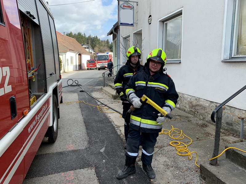 Als zweiteintreffendes Fahrzeug (gemeinsam mit dem MTF Scheideldorf) an der Einsatzstelle begann die Besatzung des Rüstlösch Göpfritz (RLFA) sofort eine Löschleitung vorzubereiten, damit der - während der Fahrt ausgerüstete - Atemschutztrupp sofort einen Innenangriff durchführen konnte. Bei der weiteren Erkundung bzw, nach Rücksprache mit dem örtlichen Einsatzleiter HBI Hermann Kampf, durch den GRKDT des RLFA konnte jedoch festgestellt werden, dass der Brand durch erste Löschmaßnahmen bereits weitgehend gelöscht wurde.
