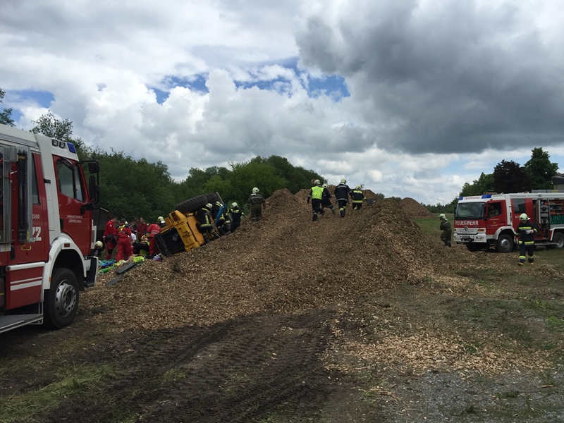 Der Lenker eines Radladers ist beim Befahren eines Hachschnitzellagers mit dem Radlader seitlich umgestürzt und unter dem Radlader eingeklemmt worden.