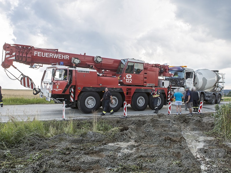 Ein Betonmischwagen ist auf der LH55 zwischen Göpfritz/Wild und Almosen mit einem Sattelaufleger kollidiert und ist anschließend in einem Acker zum Stillstand gekommen. Beton und Schotter ergossen sich über die Fahrbahn, der Lenker des Betonmischwaggens wurde verletzt.