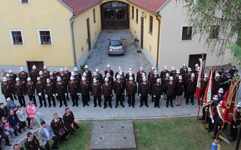 Dort warteten bereits Feuerwehrkommandant BR Christian Hübl und sein Stellvertreter OBI Franz Steinbauer. Ebenso hat sich bereits ein Teil der Bevölkerung vor dem Feuerwehrhaus eingefunden um sich dieses Spektakel, so wie jedes Jahr, anzusehen.