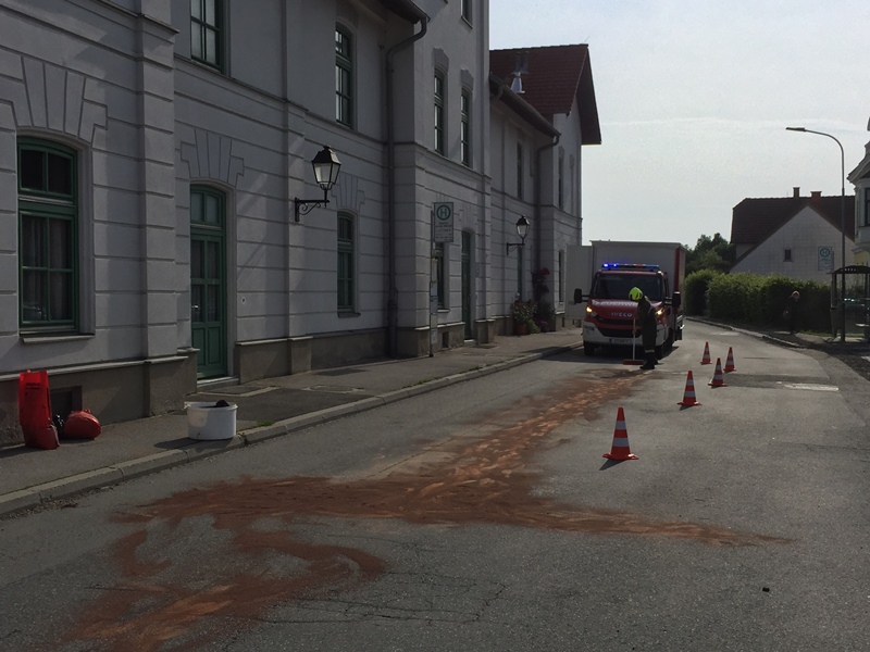 Nach einem technischen Gebrechen an einem Autobus flossen Betriebsstoffe aus, weshalb die Feuerwehr ausrückte, um die Betriebsstoffe zu binden.