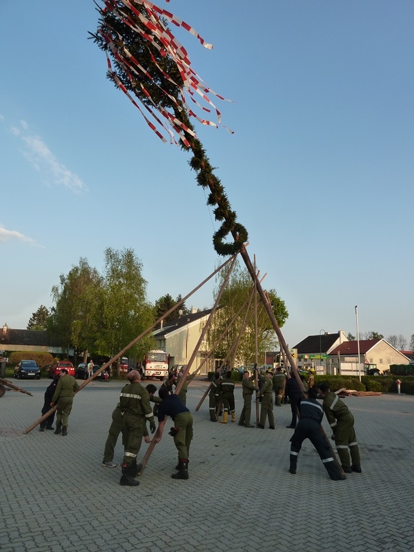 Göpfritz/Wild - Auch heuer folgte man wieder der Tradition des Maibaum aufstellens. So machten sich die Mitglieder der Freiwilligen Feuerwehr Göpfritz/Wild am frühen Abend des 30. April 2014 auf den Weg um den bereits vorbereiteten Maibaum abzuholen und zum Feuerwehrhaus zu überstellen.