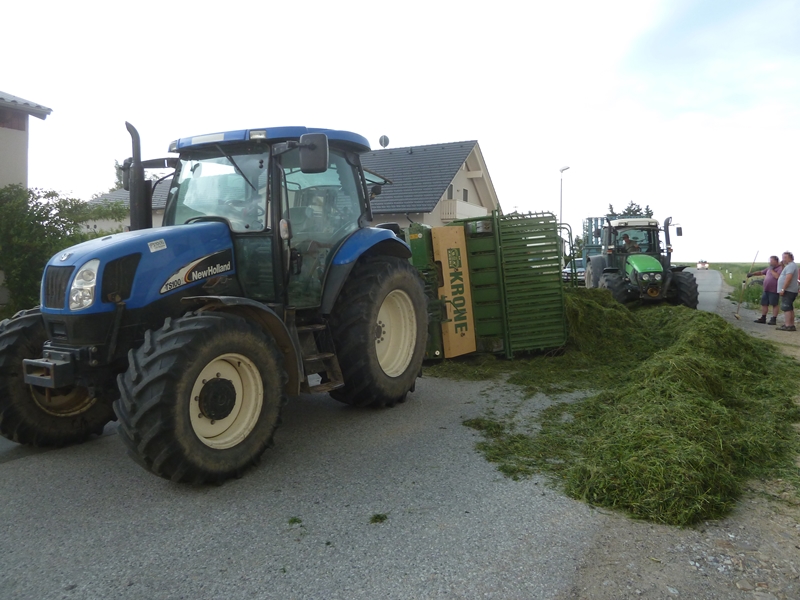 Aus bisher unbekannter Ursache löste sich auf einem voll beladenen Ladewagen während der Fahrt die Hinterachse vom Ladewagen, woraufhin der Aufbau des Ladewaggens umkippte und das mitgeführte Ladegut auf die Fahrbahn kippte.