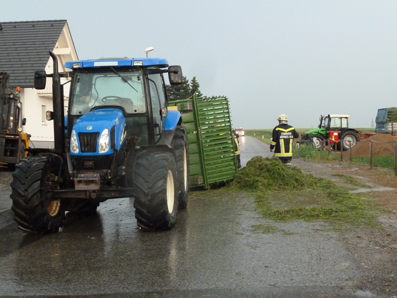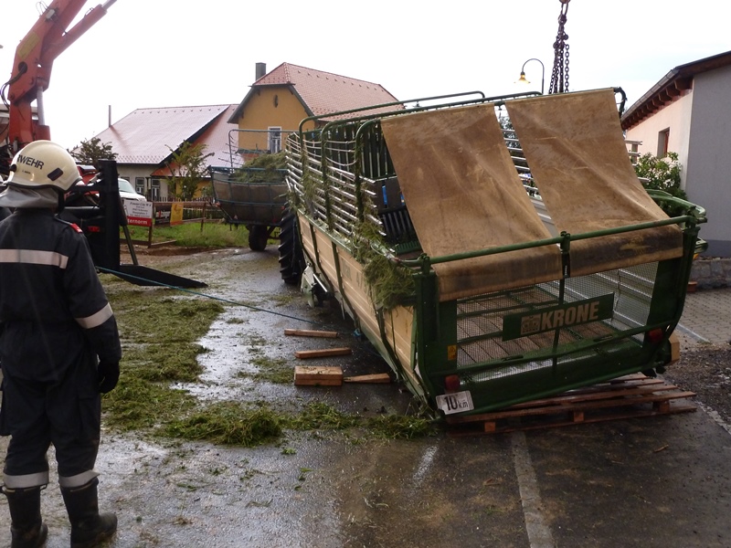 Göpfritz/Wild - Die Freiwillige Feuerwehr Göpfritz wurde am Mittwoch, dem 11. Juni 2014 um 19.43 Uhr, von Florian Niederösterreich zur Bergung eines umgestürzten Ladewaggens auf der Merkenbrechtserstraße in Göpfritz/Wild alarmiert.