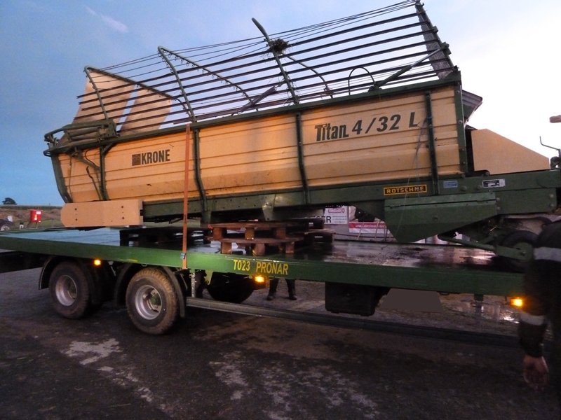 Aus bisher unbekannter Ursache löste sich auf einem voll beladenen Ladewagen während der Fahrt die Hinterachse vom Ladewagen, woraufhin der Aufbau des Ladewaggens umkippte und das mitgeführte Ladegut auf die Fahrbahn kippte.