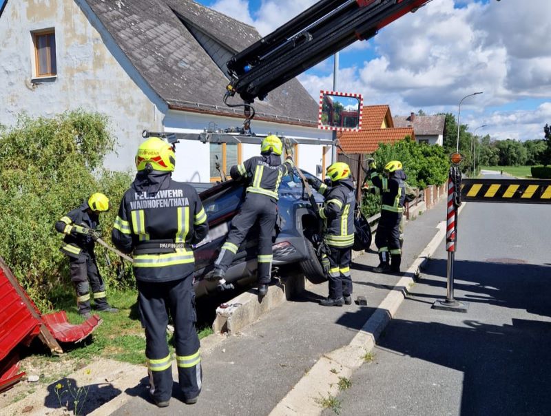 Die Erkundung ergab, dass die Bergung des PKWs nur mittels Kran möglich war. Daher wurde die Feuerwehr Waidhofen/Thaya mit dem Wechselladefahrzeug nachalarmiert. Fahrzeugbergung auf der L55 in Kirchberg/WildWährenddessen wurde durch die Besatzungen des RLFA 2000 und des LFA sowie der Mitglieder der örtlich zuständigen Feuerwehr Kirchberg-Schönfeld die Unfallstelle abgesichert und die austretenden Betriebsmittel aufgefangen bzw. gebunden. Gemeinsam mit den Kameraden der Feuerwehr Waidhofen/Thaya konnte das Fahrzeug geborgen werden und zu einem Abstellplatz gebracht werden. Im Anschluss daran wurde die Umgebung noch von Kleinteilen gereinigt.