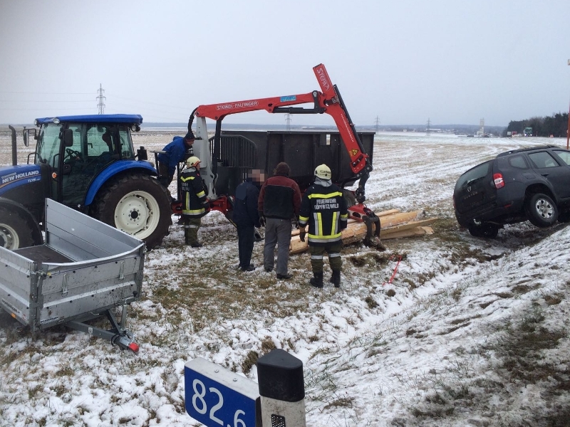 Bei der Unfallstelle angekommen, konnte man nach der Absicherung der Unfallstelle direkt mit der Bergung des PKWs beginnen. Unter Zuhilfenahme eines Rückewagens konnte man die Ladung des Anhängers umladen und anschließend den PKW aus seiner misslichen Lage befreien. Der unverletzte Lenker setzte anschließend seine Fahrt fort.